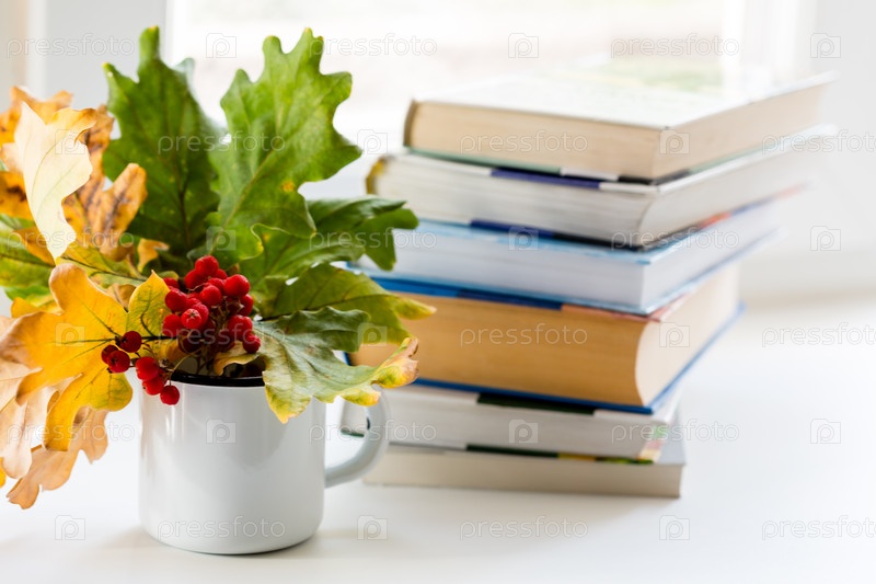 Осенняя композиция со стопкой книг и букетом желтых осенних листьев и веточек рябины в чашке. Концепция осеннего сезона, пространство для копирования
