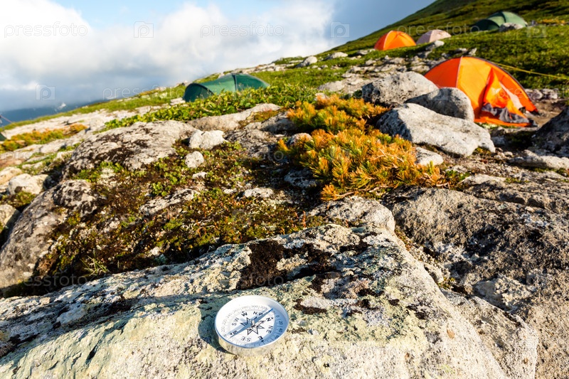 Надежный компас на камне в тундре возле палаточного городка. Концепция путешествий и активного образа жизни