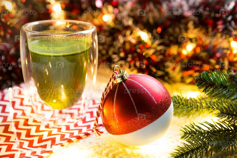 Прозрачный стеклянный стакан с двойными стенками и японским чаем маття на столе с рождественским декором. Новогодняя атмосфера, гирлянда и мишура, еловая ветка, уют, вязаный плед, шар, полосатая салфетка