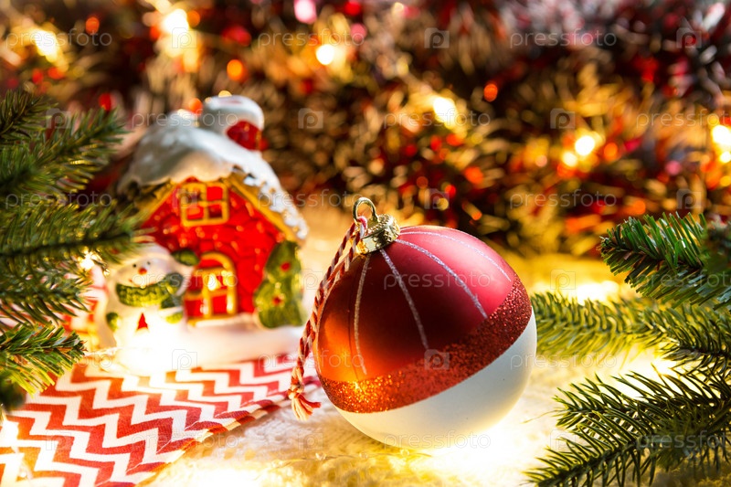 Красный елочный шар с полосками на салфетке зигзагом, в огнях гирлянд. Праздничный декор, уют, вязаное одеяло, еловые ветки. Новый год дома