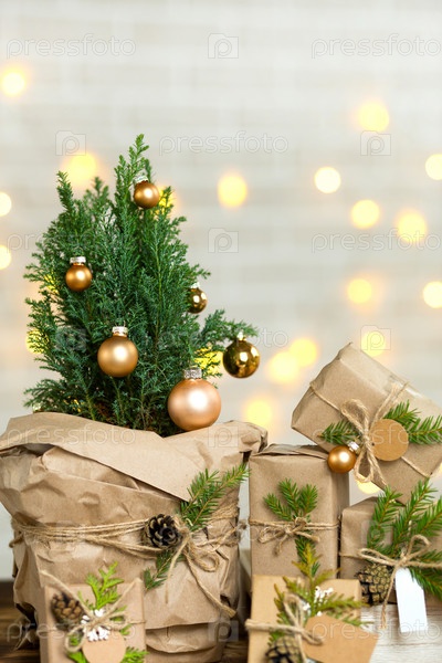 Комнатный кипарис в горшке украшен шарами наподобие елки с гирляндами. Подарочные коробки с натуральным декором к Новому году и Рождеству. Экологичный, ноль отходов, домашнее растение, зеленый дом. Копировать пространство