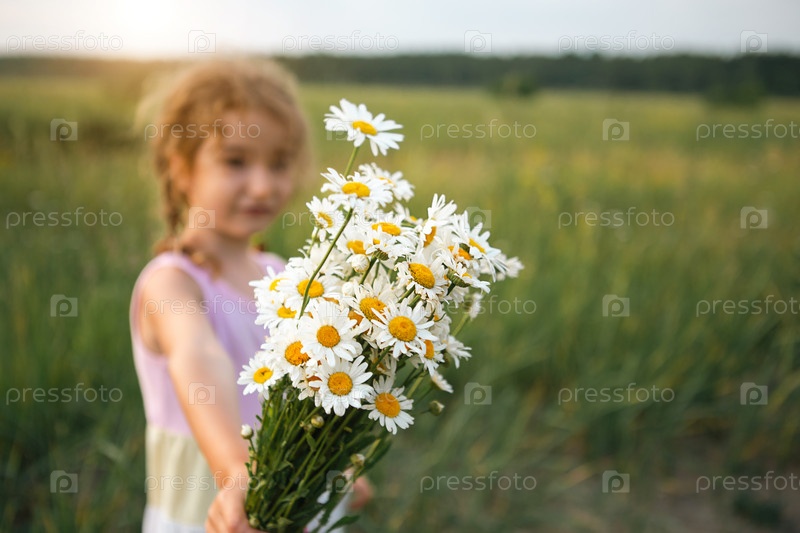 Портрет милой девочки с букетом ромашки летом на зеленом естественном фоне. Счастливый ребенок, скрытое лицо, без лица, усыпанный цветами. Скопируйте пространство. Аутентичность, сельская жизнь, экологичность