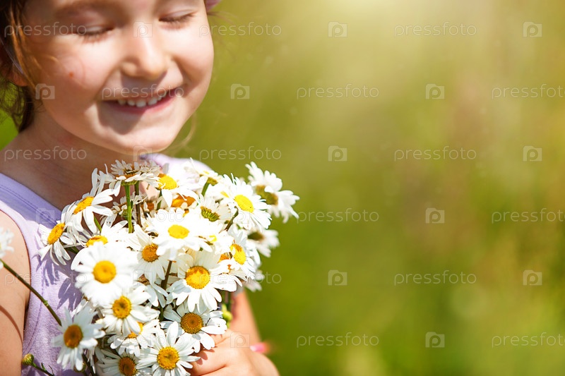 Маленькая девочка с букетом ромашек летом на зеленом естественном фоне. Счастливый ребенок, скрытое лицо, без лица, усыпанный цветами. Скопируйте пространство. Аутентичность, сельская жизнь, экологичность