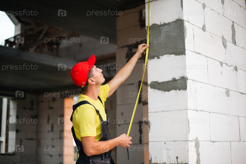 Строитель на строительной площадке измеряет длину оконного проема и кирпичной стены рулеткой. Коттедж из ячеистых бетонных блоков, спецодежда - комбинезон и бейсболка