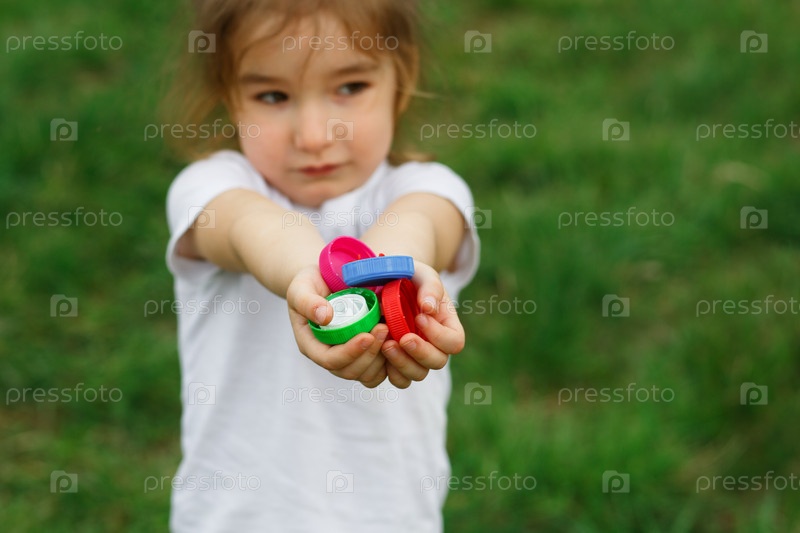 Маленькая девочка держит в руках крышки от пластиковых бутылок. Волонтерская благотворительная акция «Добрые крышки» в помощь детям-сиротам