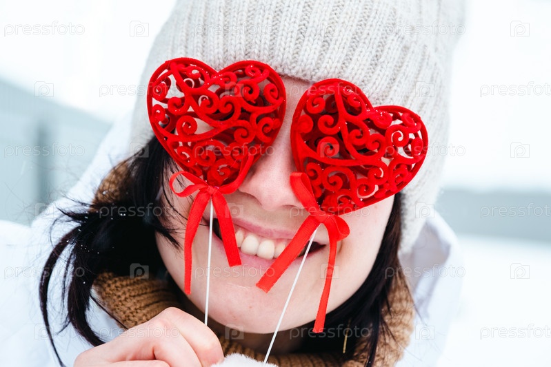 Счастливая женщина с декором в форме сердца, похожим на очки на глазах, зимой в теплом белом пальто и шляпе. День святого Валентина, любовь и увлечение, радость, валентинка для признания в любви, образ жизни