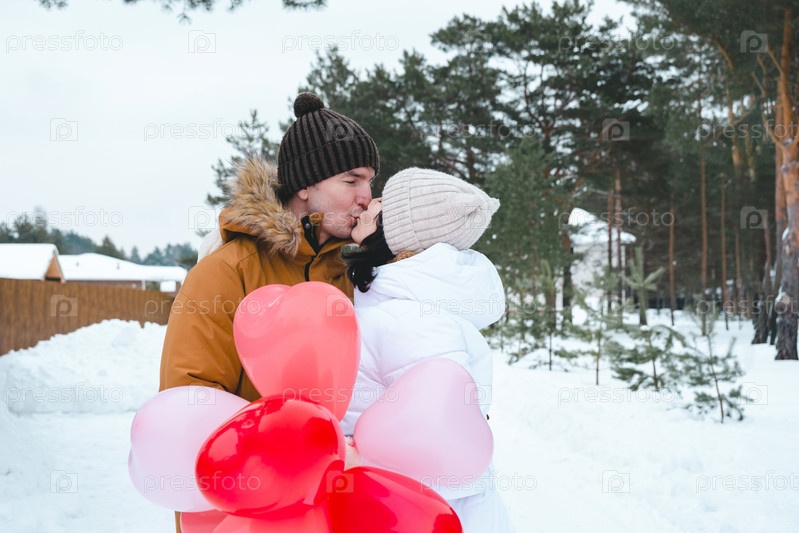 Влюбленные мужчина и женщина целуются на свидании на свежем воздухе зимой в снегу с подарком розовых и красных воздушных шаров в форме сердца. День святого Валентина, любовь, счастливая влюбленная пара на прогулке