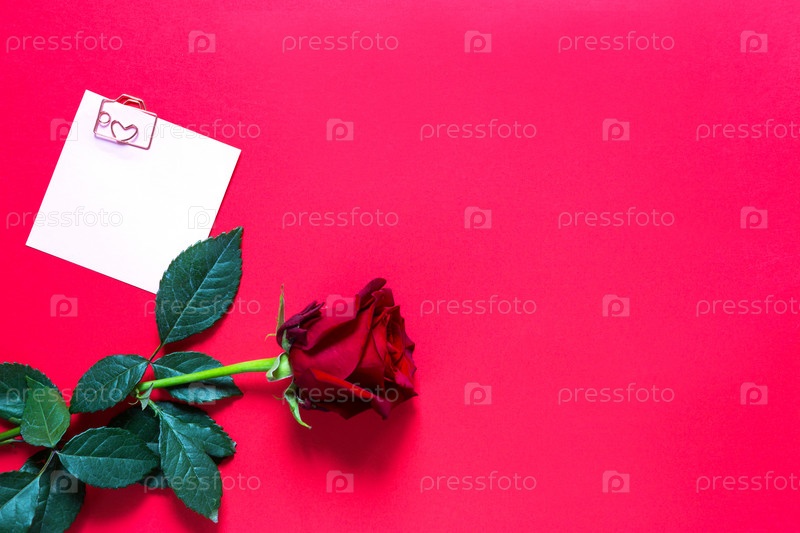 Красная роза на красном фоне с копирайтом и наклейкой со скрепкой и сердцем, напоминание на листе для заметок. Подарок женщине на праздник, приглашение на свидание, День святого Валентина, знак любви