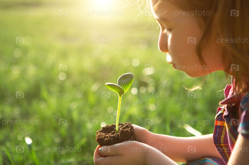 Молодой зеленый росток в руках ребенка в свете солнца на фоне зеленой травы. Натуральные саженцы, экологичность, новая жизнь, молодость. Концепция развития, мира, заботы. Копировать пространство