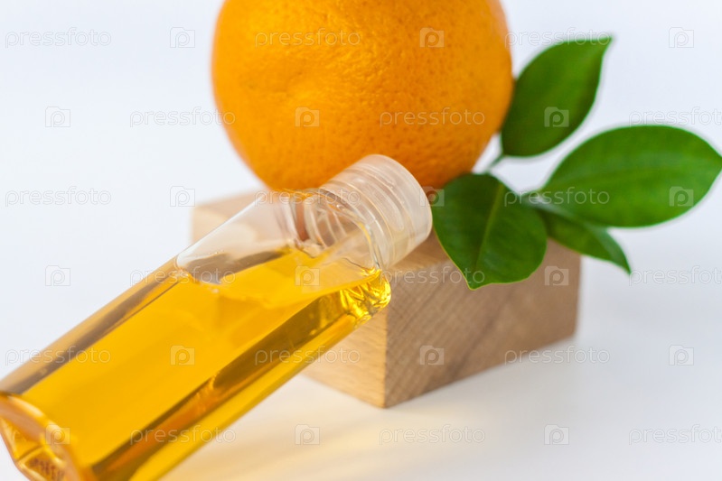 апельсиновое масло для тела. апельсин на деревянном постаменте на белом фоне. органическая косметика SPA с растительными ингредиентами
