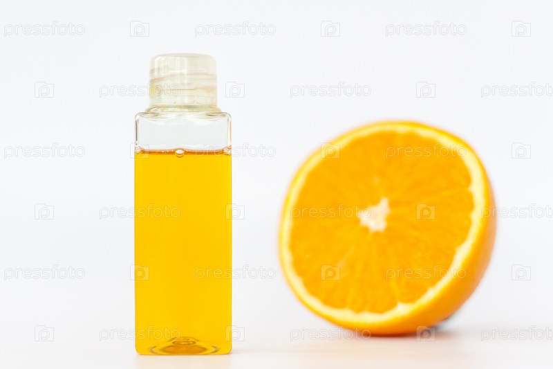 Оранжевое масло для тела.Разрежьте апельсин на белом фоне.Органическая косметика SPA с растительными ингредиентами