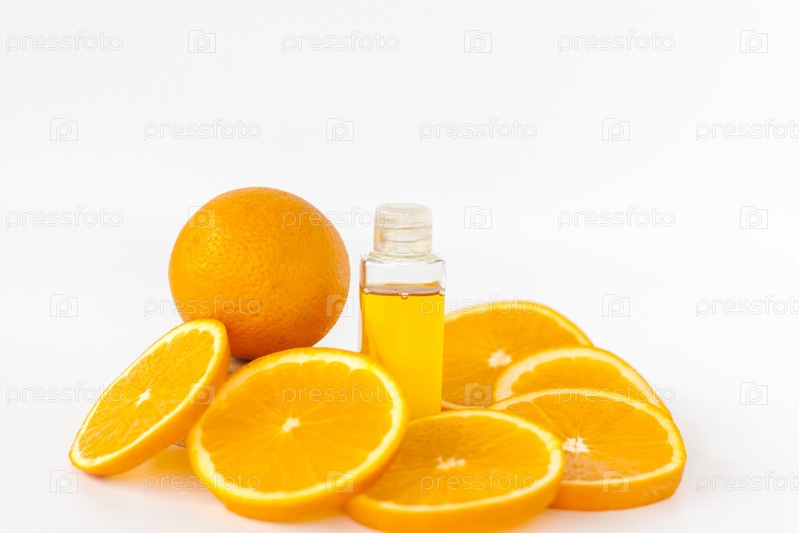 Оранжевое масло для тела. нарезанный апельсин на белом фоне. органическая косметика SPA с растительными ингредиентами