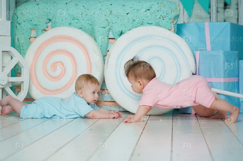 Двое детей лежат на мягкой поверхности в светлой комнате, одетые в голубую и розовую одежду. Концепция детства и ухода за ребенком