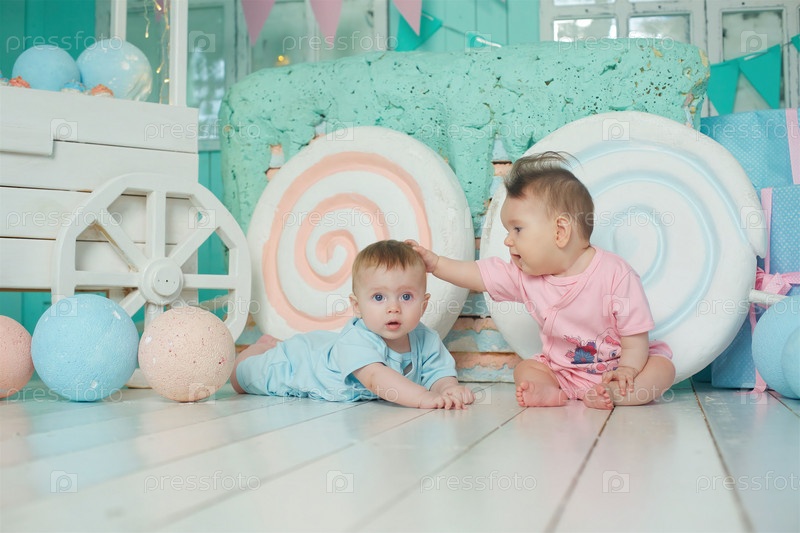 Двое детей лежат на мягкой поверхности в светлой комнате, одетые в голубую и розовую одежду. Концепция детства и ухода за ребенком