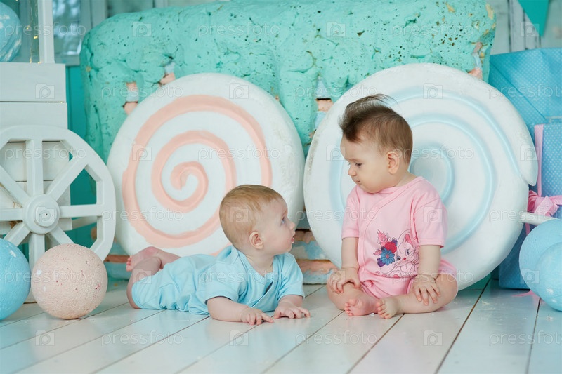 Двое детей лежат на мягкой поверхности в светлой комнате, одетые в голубую и розовую одежду. Концепция детства и ухода за ребенком
