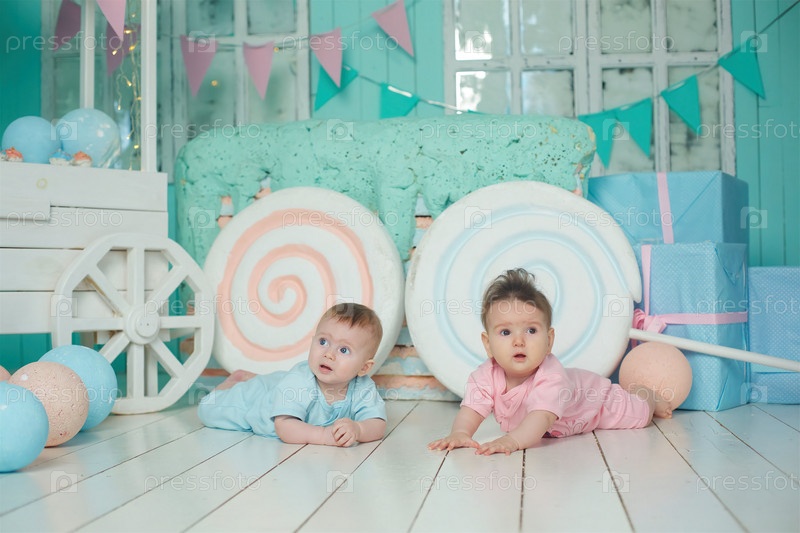 Двое детей лежат на мягкой поверхности в светлой комнате, одетые в голубую и розовую одежду. Концепция детства и ухода за ребенком
