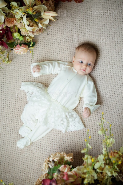 Маленькая новорожденная девочка лежит в белой одежде на бежевом покрывале