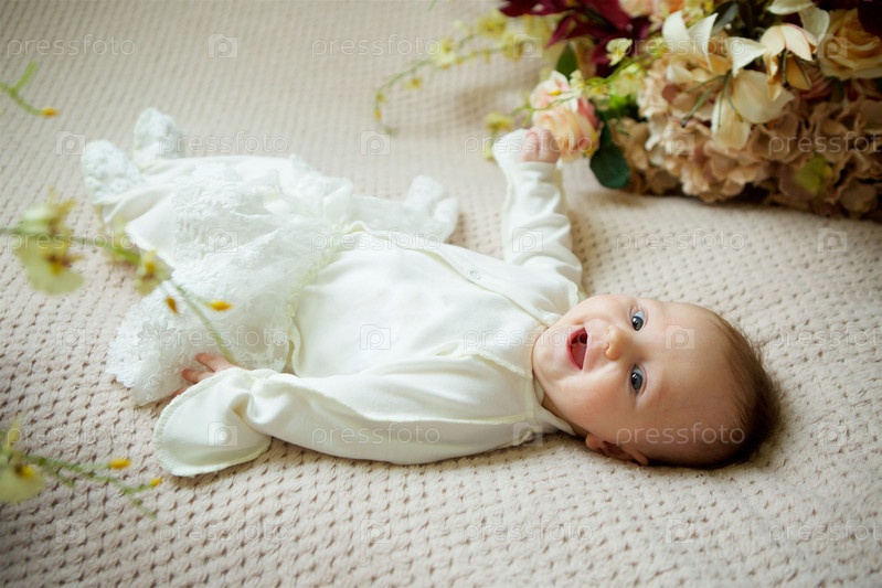 Маленькая новорожденная девочка лежит в белой одежде на бежевом покрывале