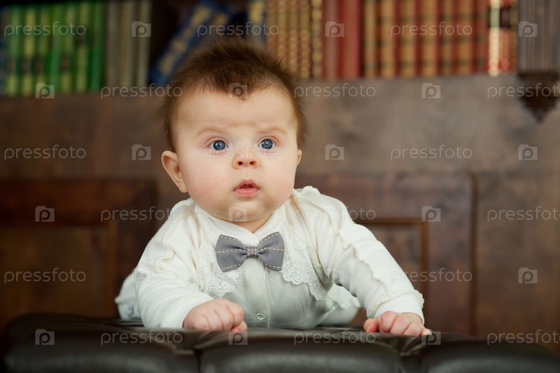 Маленький мальчик лежит на мягкой поверхности. На заднем плане библиотека с книгами