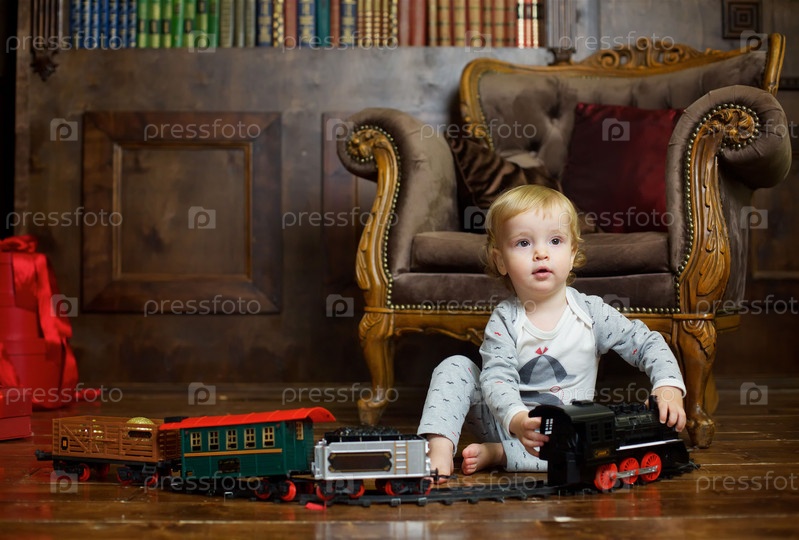 Маленький мальчик сидит на полу и играет на заводном поезде