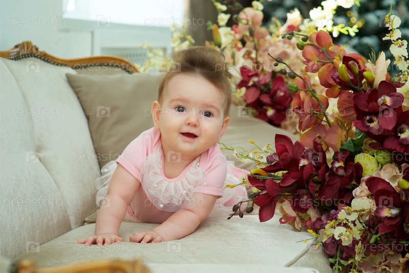 Маленькая девочка лежит на винтажном диване в розовой одежде