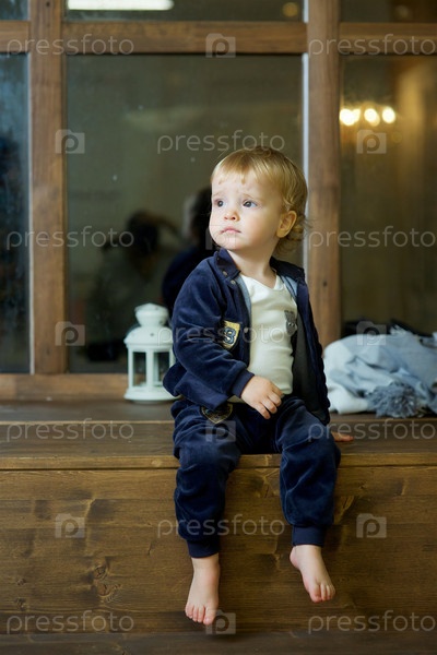 Ребенок мальчик 1 года сидит на деревянной поверхности и играет с фарфоровым чайником. Младенец с белыми волосами и локонами в темно-синей одежде. Детские развлечения и досуг