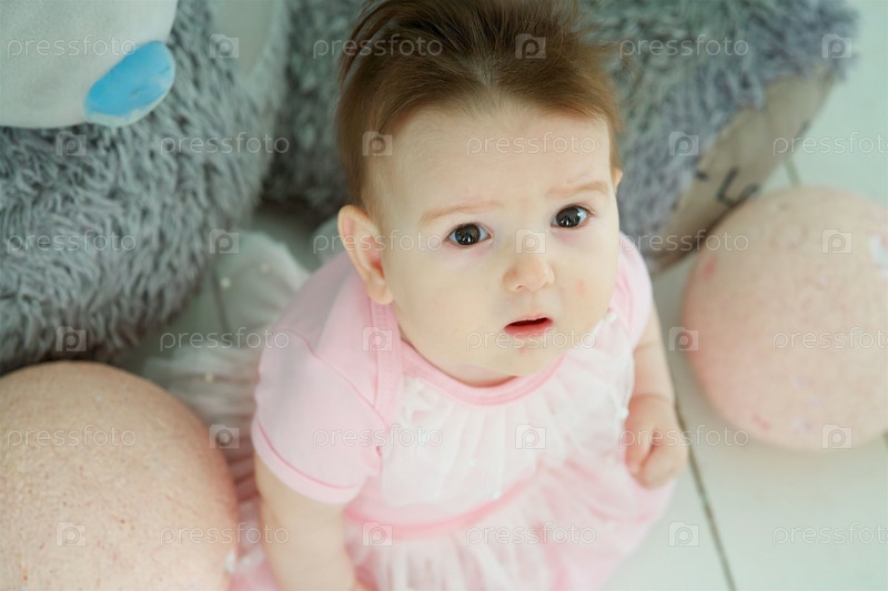 Маленькая девочка сидит на полу в комнате в розовой одежде