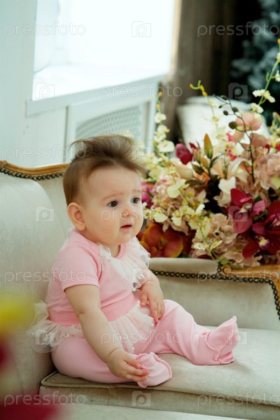 Маленькая девочка сидит на винтажном диване в розовой одежде