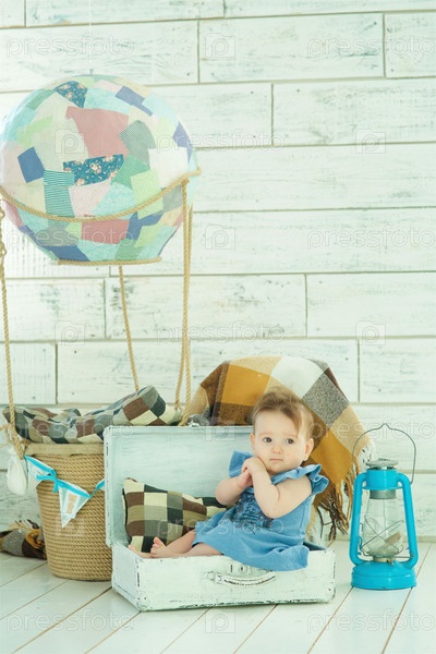 Маленькая новорожденная девочка в голубом платье сидит в чемодане. Концепция детства и материнства, путешествия с детьми