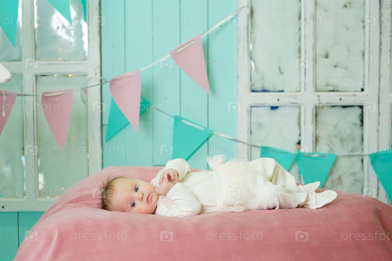 Маленькая новорожденная девочка лежит в белой одежде на розовом одеяле