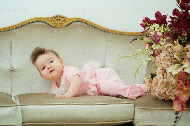 Маленькая девочка лежит на винтажном диване в розовой одежде