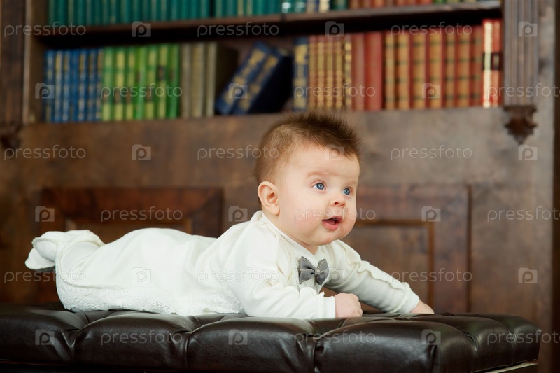 Маленький мальчик лежит на мягкой поверхности. На заднем плане библиотека с книгами