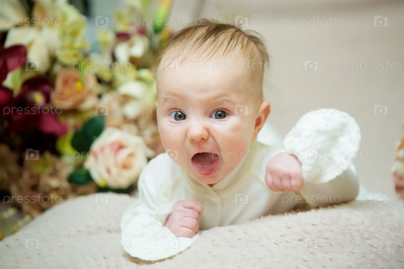 Маленькая новорожденная девочка лежит на животике в белой одежде на бежевом одеяле