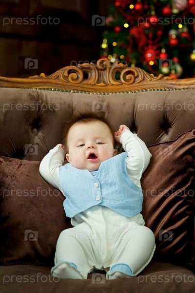 Младенец сидит на элитном диване