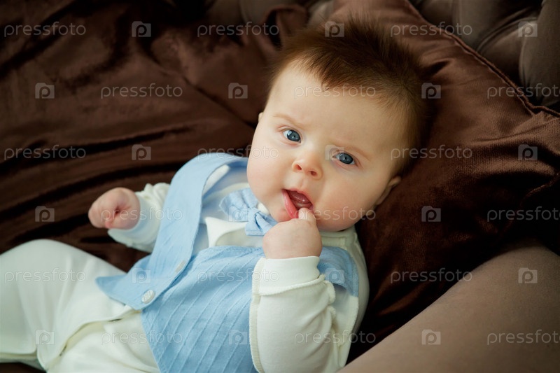 Младенец сидит на элитном диване