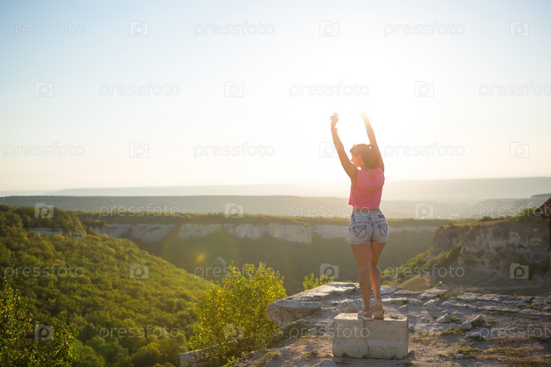 Женщина-туристка с поднятыми руками смотрит на панорамный вид на вершину горы и радуется, наслаждается свободой и приключениями. Треккинг, путешествия, активный экотуризм, здоровый образ жизни, походы