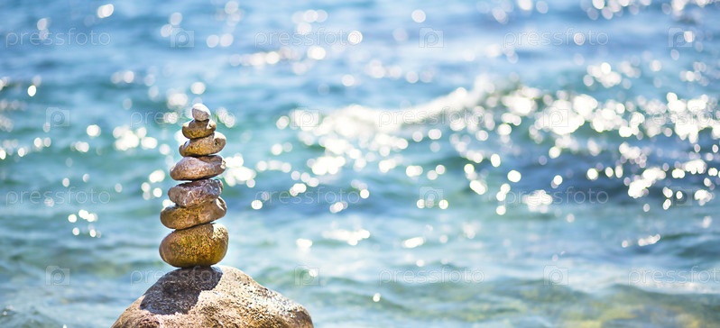 Пирамида из гальки на большом камне на фоне моря и солнечных бликов на воде. Тур, туризм, отдых на курорте, купание. Фон путешествия, солнцезащитный крем. Копировать пространство