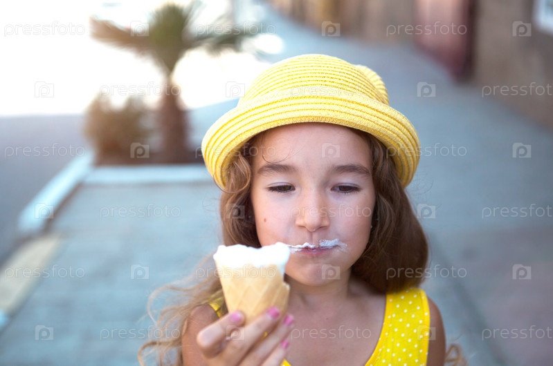 Летом ребенок с удовольствием ест вкусное мороженое на улице, испачкав рот. Девушка в желтой шляпе и сарафане в пылу портрета крупным планом
