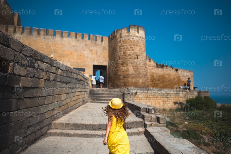 Туристка в желтой шляпе и сарафане идет по улице старого города из камня с крепостью. Тур по достопримечательностям. Ребенок потерялся, ищет родителей