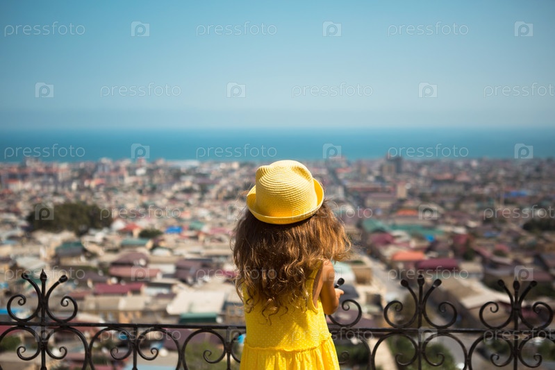 Туристическая девушка в желтой шляпе и сарафане смотрит с высоты на смотровую площадку на город. Тур по достопримечательностям. Ребенок потерялся, ищет родителей