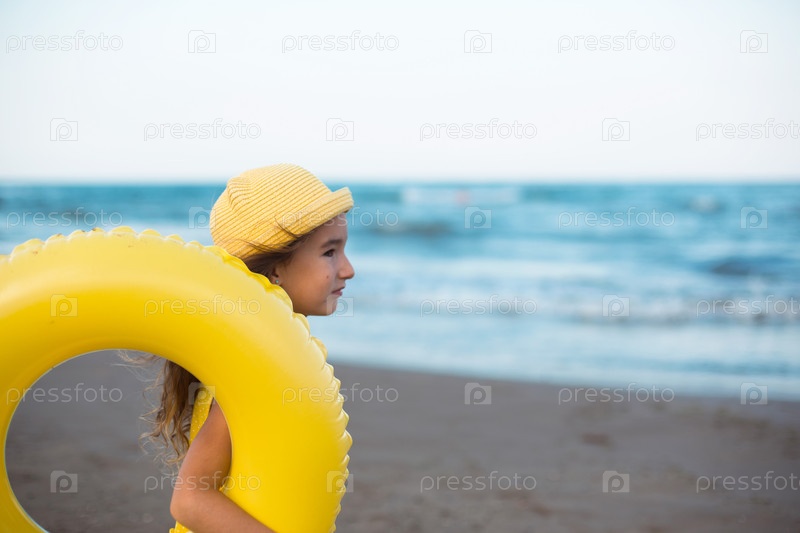 Девушка с желтым надувным кругом на берегу моря. Отдых на пляже, летние путешествия