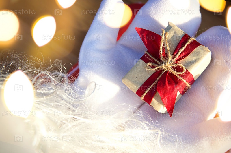 Коробка с рождественским подарком в руках Деда Мороза в белых варежках. Красный костюм, борода, гирлянды в размытом свете. Новый год, подготовка, ожидание чуда, сбывшаяся мечта. Крупным планом