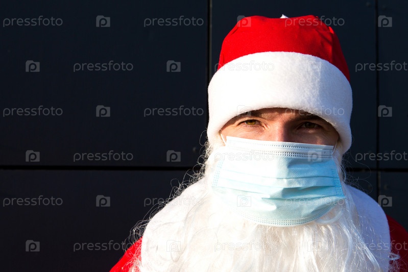 Санта-Клаус с белой бородой в красном пальто в медицинской маске. Рождество в условиях пандемии коронавируса, сезонных болезней, ОРВИ и пневмонии в праздничные дни. Защита от вирусов в новом году