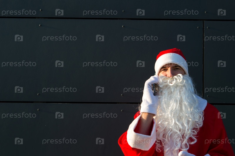 Современный Санта-Клаус разговаривает по телефону. Заказ услуг аниматора на Рождество и Новый год. Онлайн приветствия через интернет и мобильную связь, социальная дистанция
