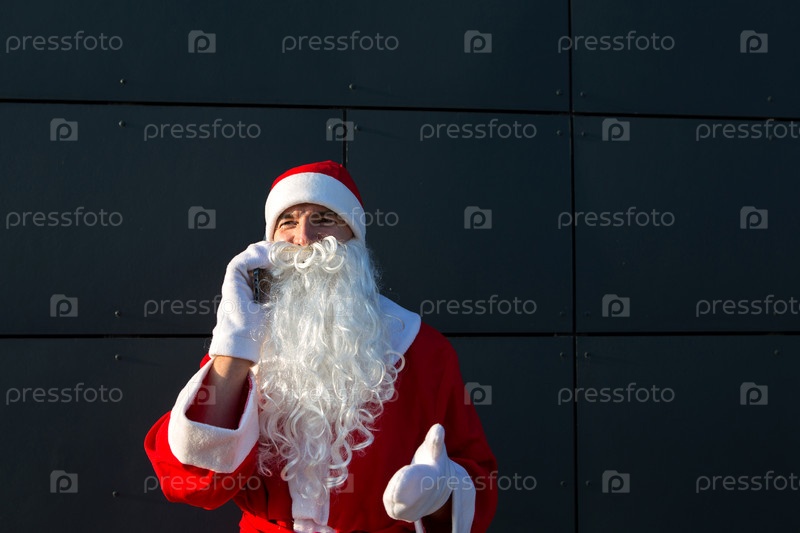 Современный Санта-Клаус разговаривает по телефону. Заказ услуг аниматора на Рождество и Новый год. Онлайн приветствия через интернет и мобильную связь, социальная дистанция