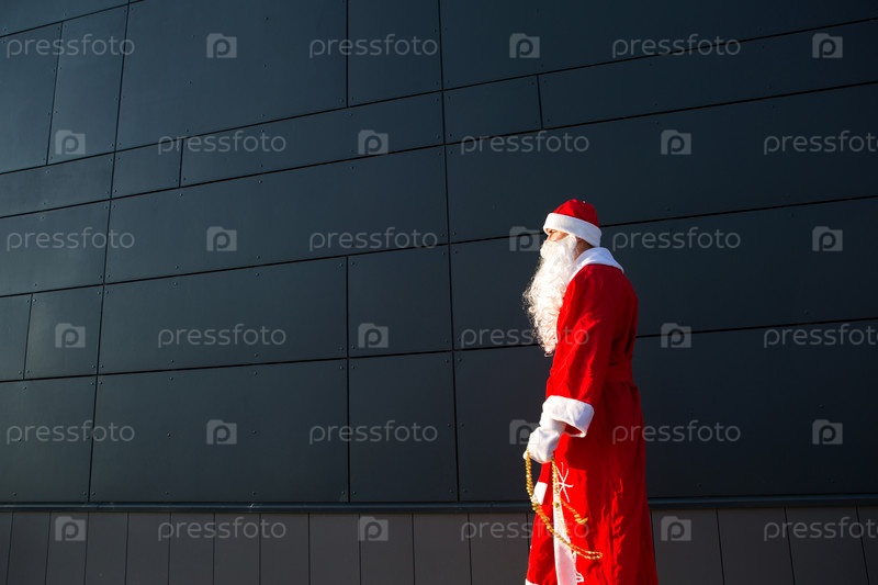 Молодой человек, одетый как Санта на улице, стоит у серой современной стены. Белая борода, красный костюм и шляпа. Рождество, Новый год. Русский дедушка Мороз. Серый современный фон, пространство для копирования