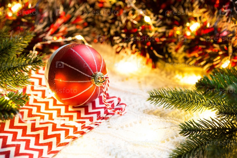 Красный елочный шар с полосками на салфетке зигзагом, в огнях гирлянд. Праздничный декор, уют, вязаное одеяло, еловые ветки. Новый год дома