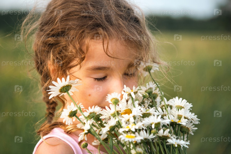 Портрет милой девочки с букетом ромашки летом на зеленом естественном фоне. Счастливый ребенок, скрытое лицо, без лица, усыпанный цветами. Скопируйте пространство. Аутентичность, сельская жизнь, экологичность