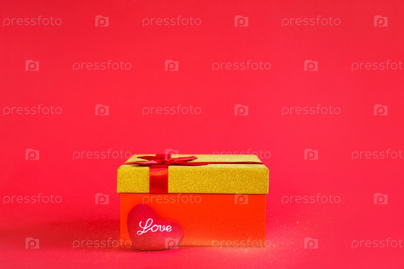 Открытая красная подарочная коробка с бантом и мягким сердцем с надписью «Любовь в золотом сиянии и блеске внутри на красном фоне, баннер, копирайт». всеобщий праздник, день святого валентина, новый год, день рождения
