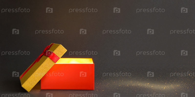 Открытая красная подарочная коробка с бантом с золотым сиянием и блеском внутри на черном фоне, баннер, копирайт. всеобщий праздник, рождество, день святого валентина, новый год, день рождения, черная пятница